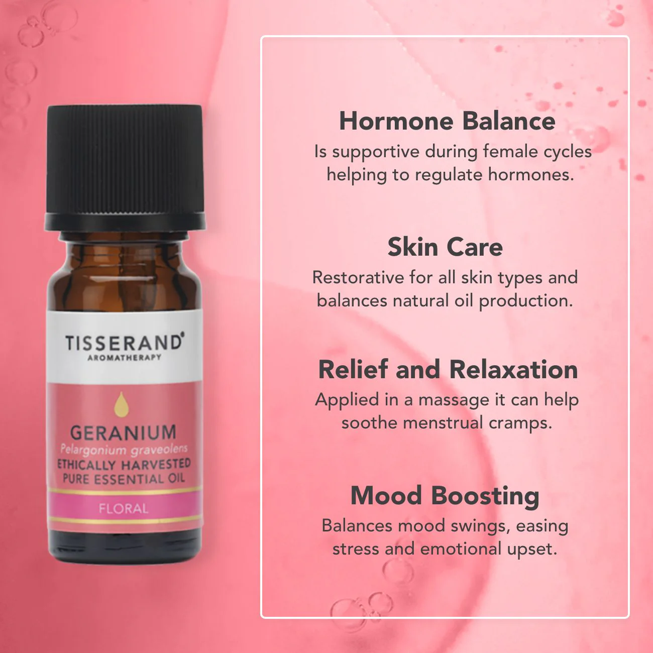 Geranium essential oil has a soft, soothing and sweet aroma with a distinct rosy note. It’s a popular choice for bringing emotional balance and harmony to both mood and skin. It’s both sweet and intensely floral.