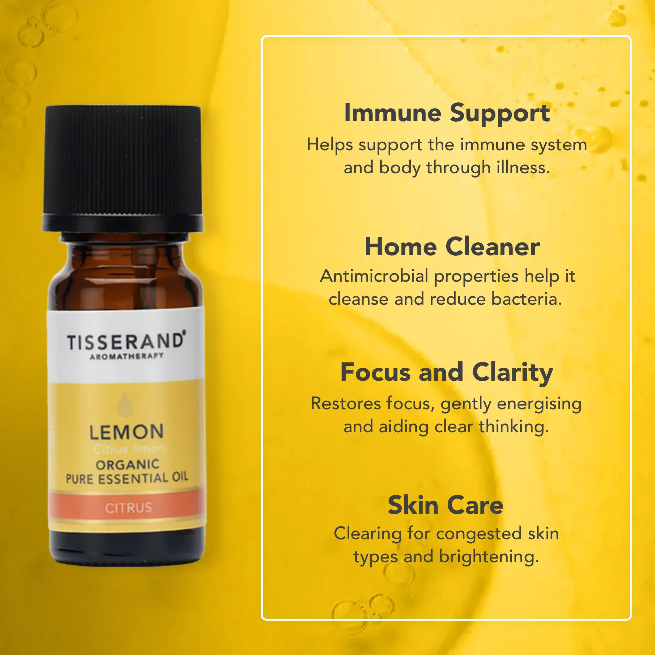 Lemon essential oil bursts with a sharp yet slightly sweet citrus scent that feels instantly fresh and bright. Its zesty, fruity aroma is crisp and uplifting, with light, fizzy top notes that cut through stale air and help to relieve mental fog.