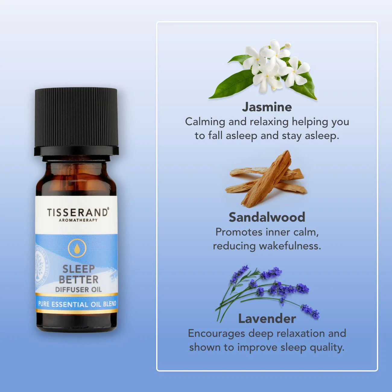 Transform your space into a calming sanctuary with the Sleep Better Diffuser Oil. Designed for use in a diffuser, aroma spa or oil burner, this dreamy blend combines 100% natural pure essential oils of soothing Lavender, warming Sandalwood and calming Jasmine to help you relax and prepare for a blissful night’s sleep.