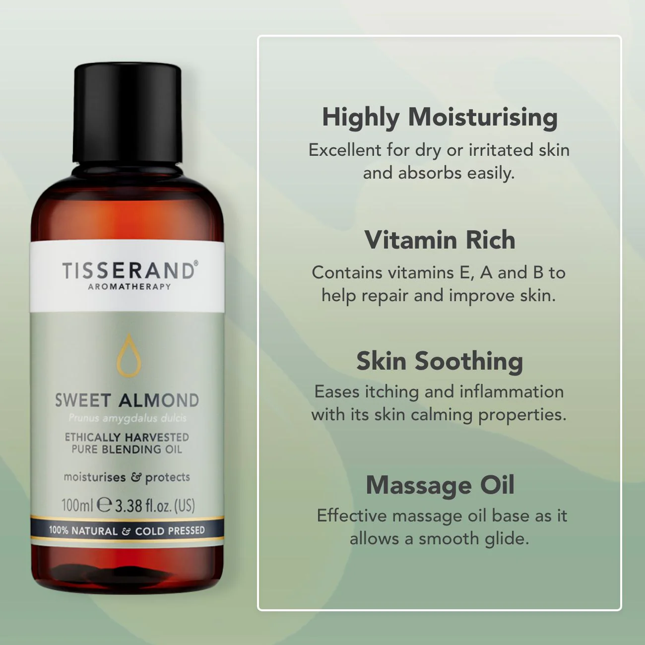Sweet Almond Oil is gentle yet deeply nourishing. It’s great for dry, damaged or irritated skin. Use it on its own for a nourishing boost or blend with your favourite essential oils to create your own aromatherapy treatments that comfort both body and mind.