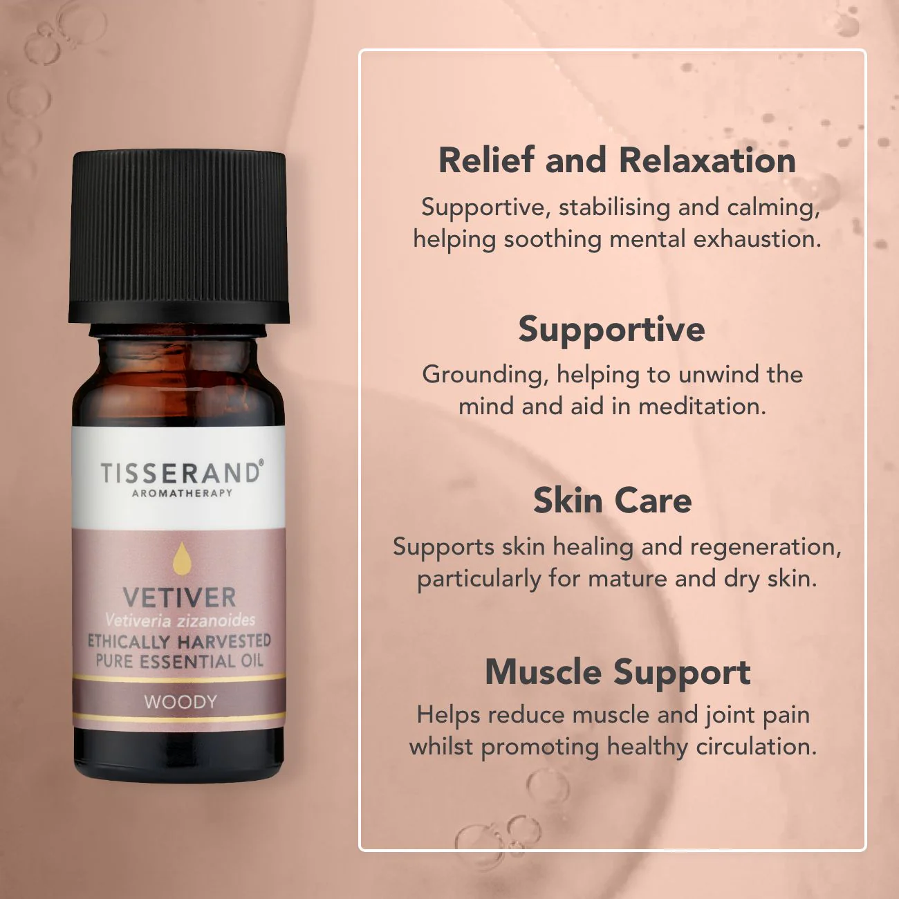 Smoky, sophisticated and expansive, Vetiver essential oil is known as ‘the oil of tranquillity.’ It has a rich, earthy aroma that’s both grounding and deeply soothing, and a long-lasting scent that makes it a favourite for unwinding after a busy day or settling into meditation. It can also help to ease muscle tension and the physical effects of emotional strain.